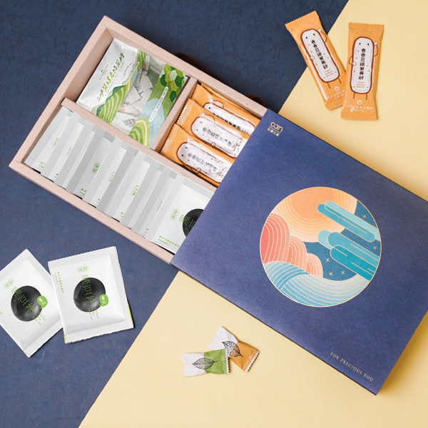 《 圓滿》健康茶點禮盒,包裝視覺以簡約的設計手法描繪夜空下的三峽山河風光,希望打造一款靜謐而典雅的經典禮盒。在這佳節團聚時刻,甘樂文創獻上最深的祝福,希望無論是送禮的人或是收禮的人都能事事圓滿,一切順心。